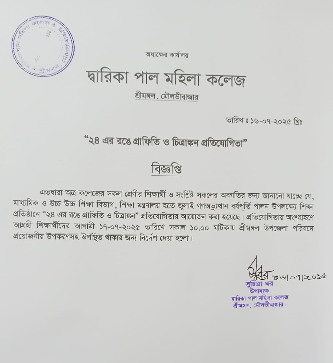 | 4 | 2025-07-16 | ২৪ এর রঙে গ্রাফিতি - চিত্রাঙ্কন প্রতিযোগিতা | View Download |